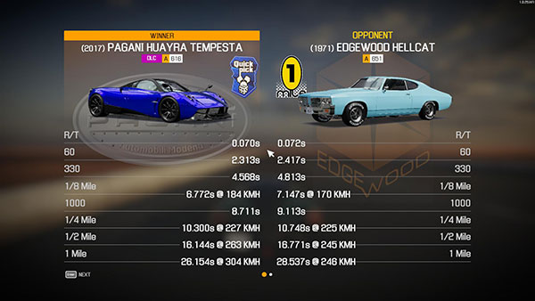 بعد كل شوط ، يتم تقديم إحصائيات مفصلة عن أوقات السحب ، بالإضافة إلى بيانات عامة مثل 0-60 مرة ، 0-100 مرة ، إلخ.